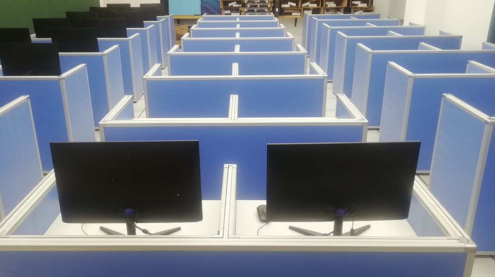广州南沙区亚加达国际预科升降屏风电脑桌,外语听力考试桌效果